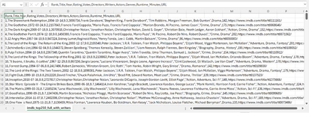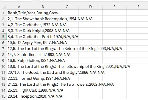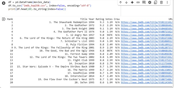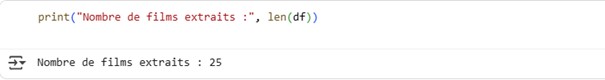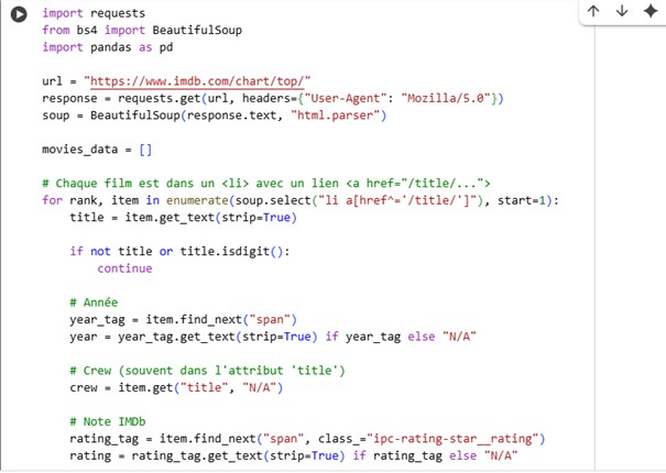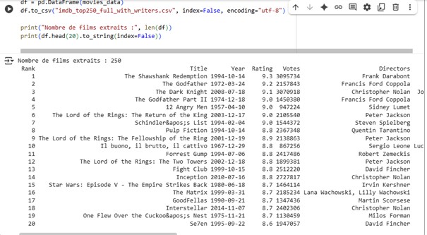 L’extraction des 250 films les mieux notés d’IMDb a été réalisée avec succès. Les données sont prêtes pour une analyse exploratoire et une visualisation statistique.