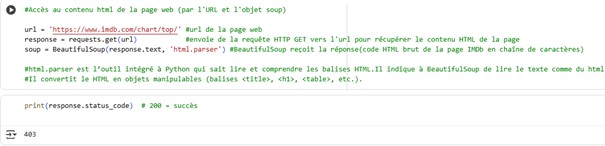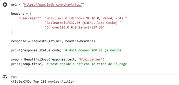 IMDb bloque souvent les requêtes sans User-Agent (erreur 403). La solution consiste à ajouter un en-tête User-Agent pour simuler un navigateur.