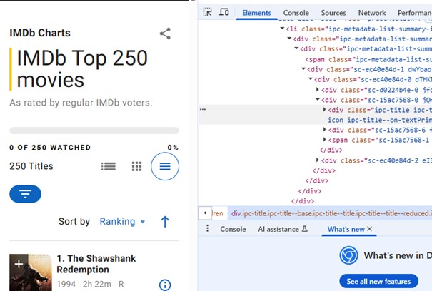 Dans ce projet, l’objectif est d’extraire les informations relatives aux 250 films les mieux notés sur IMDb à l’aide de Python et de bibliothèques spécialisées en web scraping. L’extraction est réalisée dans un cadre éducatif et dans le respect des conditions d’utilisation d’IMDb.