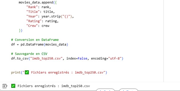 Pour réutiliser les données, exportez-les en CSV avec df.to_csv('imdb_top250.csv', encoding='utf-8', index=False)